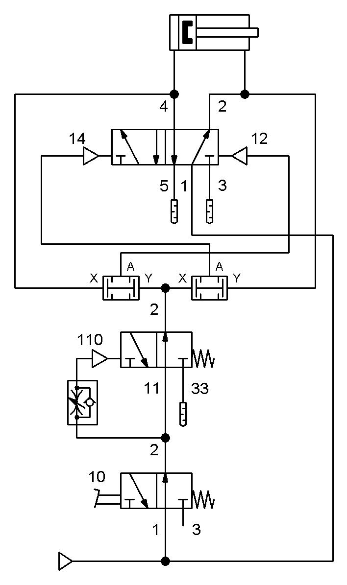 4、采用两个廉价的逻辑“与”阀控制2位5通气控阀的换向。